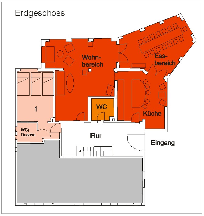 Der Flur mit Garderobe und das Gemeinschafts-WC runden den Bereich im Erdgeschoss ab.